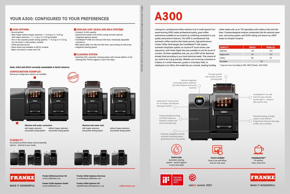 Don’t let the size mislead you: the Franke A300 features our outstanding FoamMaster™, giving customers an unlimited choice of foam consistencies, what is unique in this machine segment.