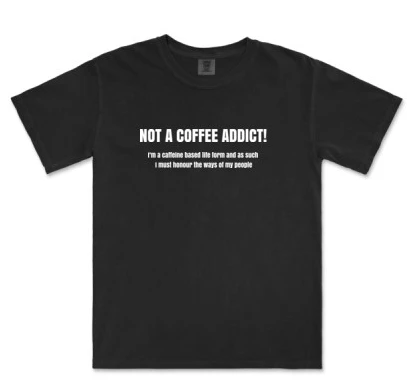 Not a Coffee Addict! Coffee T-shirts by The Espresso Doctor! Enzy washed superior screen printed T-shirts, 130gsm 100% fine cotton with high count 40s combed for softness & comfort.